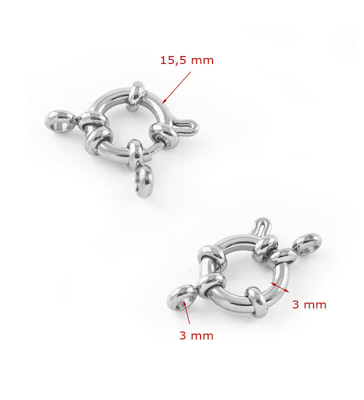 Kroužkové zapínání z nerezové oceli o průměru 10 až 18mm s korálkama. Strojně leštěné, v originální i zlaté barvě, povlakované kvalitní vakuovou PVD metodou v České republice. Zapínání má navařené rondelky, které na jedné straně nelze pro zlacení odejmout, proto dochází na jedné straně ke stínění a nepokovení menší části. Bližší informace ohledně PVD povlakování naleznete na našem blogu nebo nápovědě FAQ.
